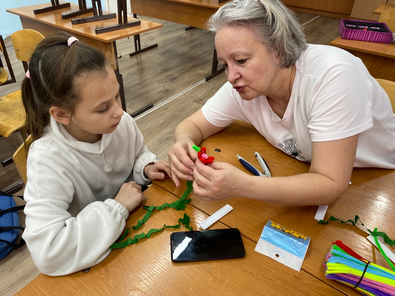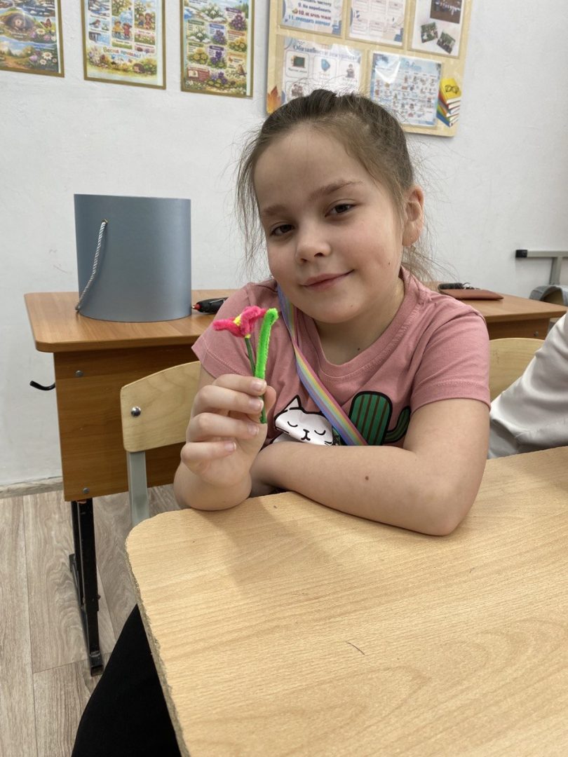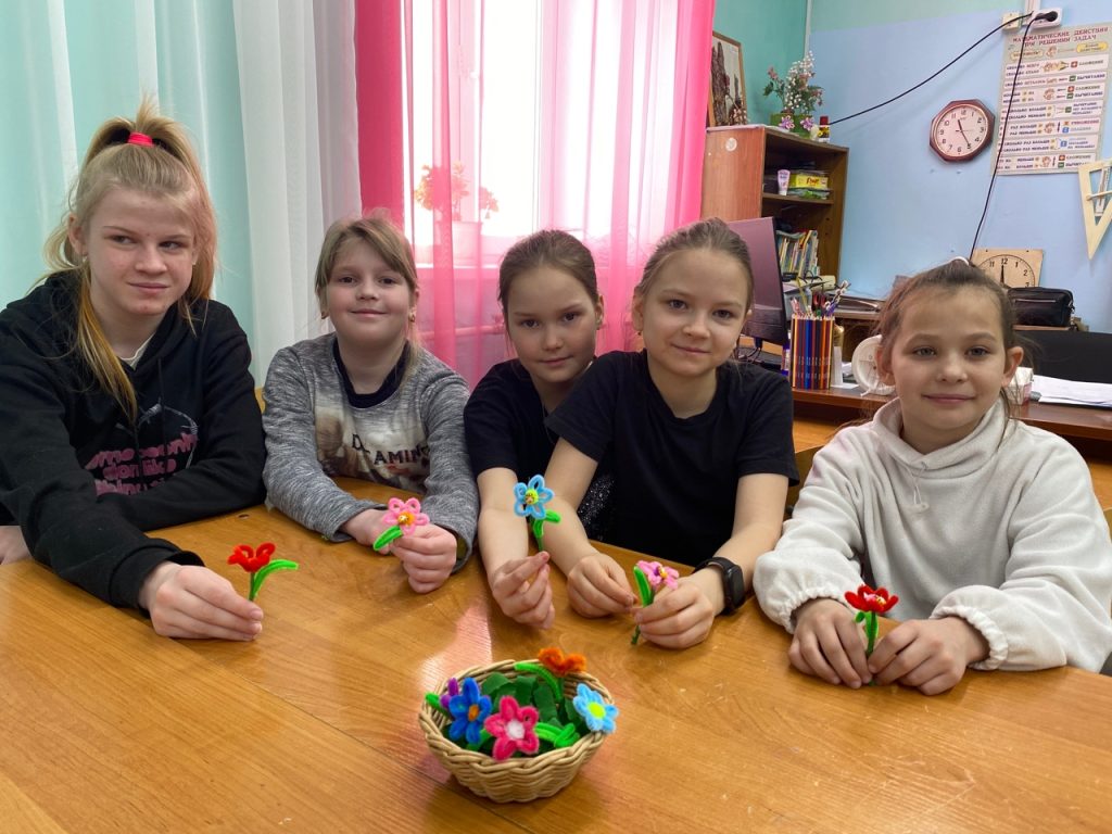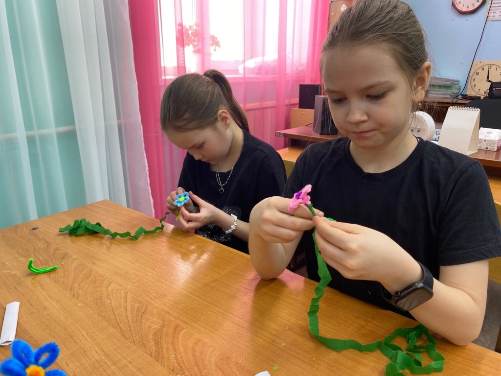 Вместе с Еленой Сергеевной Выходцевой юные мастера создавали яркие весенние цветы. Освоив технику плетения из мягкой и пушистой синельной проволоки, каждый участник смог сделать оригинальный сувенир, который стал украшением дома или подарком для близких.