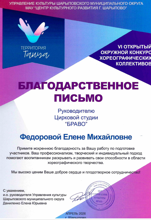 18–19 апреля в городе Шарыпово состоялся VI открытый окружной конкурс хореографических коллективов «Территория танца». Это событие традиционно собирает самых ярких и талантливых исполнителей региона, и в этом году среди участников были и представители детско-юношеского центра села Холмогорское.