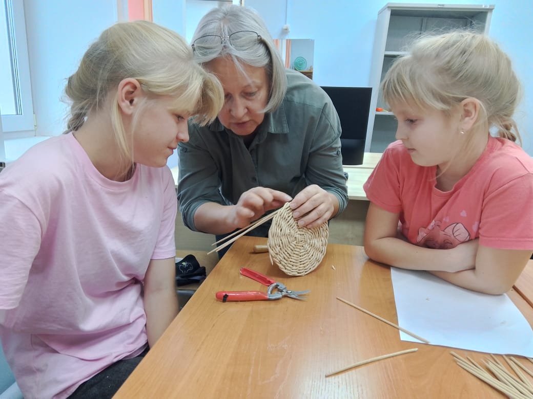 Затем ребята погрузились в атмосферу традиционной народной культуры, участвуя в увлекательных мастер-классах по народным ремеслам. Елена Сергеевна Выходцева показала мастерство плетения изящных корзиночек из цветной бумаги — древнейшего промысла, передаваемого поколениями наших предков. Ребята смогли ощутить радость совместного творчества и приобрели полезные навыки сотрудничества.