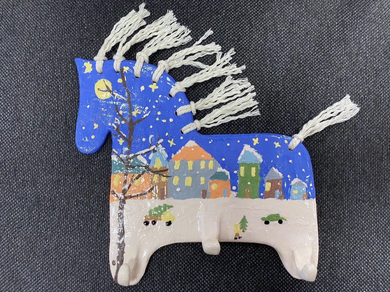 Особое внимание привлекает раздел керамики. Здесь представлены символы года — лошадки всех мастей: глиняные, расписные, с гривами из ниток. Есть и кашпо в образе Конька-Горбунка — фантастическое создание с цветочным горшком, из которого, кажется, вот-вот раздастся волшебное ржание. А рядом — конфетницы в форме лошадок, будто сошедшие с новогоднего стола из сказки Пушкина.