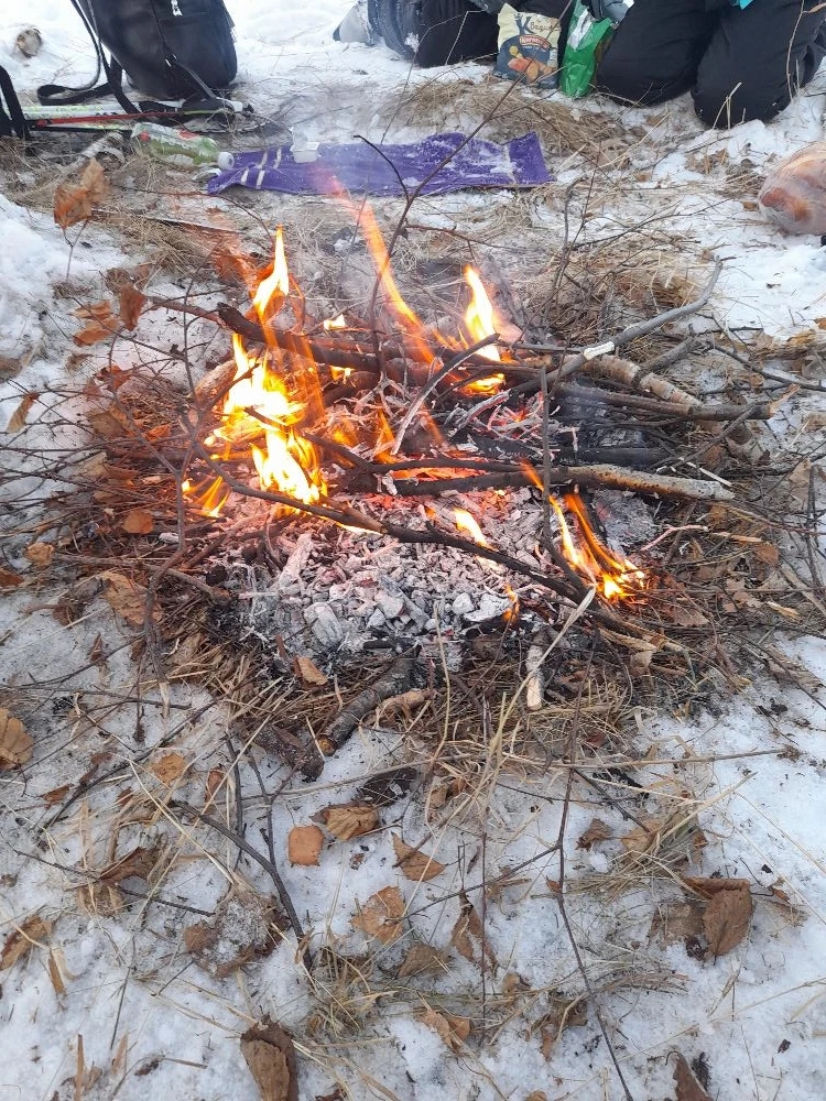 Во время привала школьники учились разводить костры в зимних условиях, развивая навыки самообеспечения в экстремальных ситуациях. Они получали горячий чай и угощались домашними заготовками, укрепляя силы и повышая настроение.